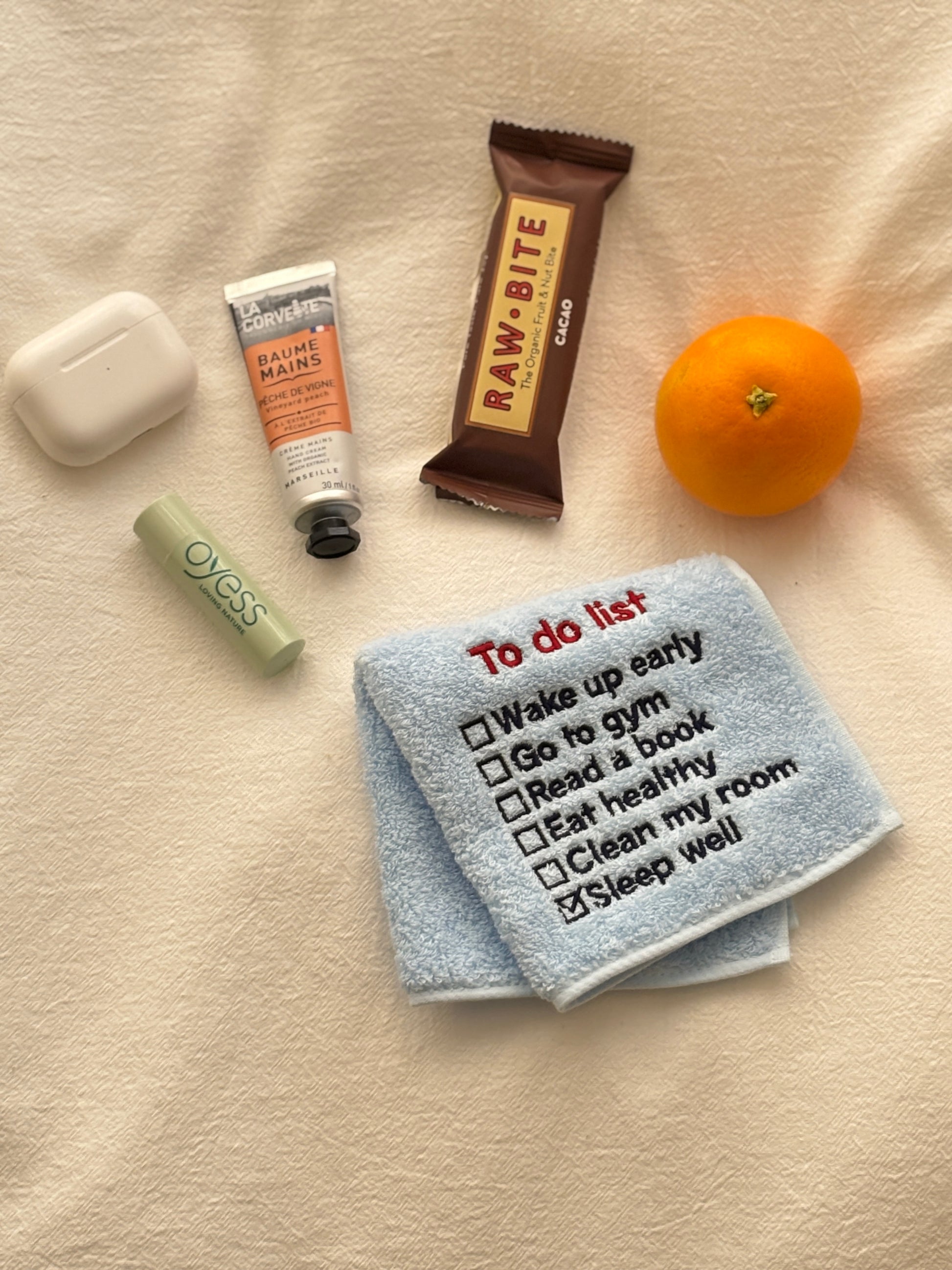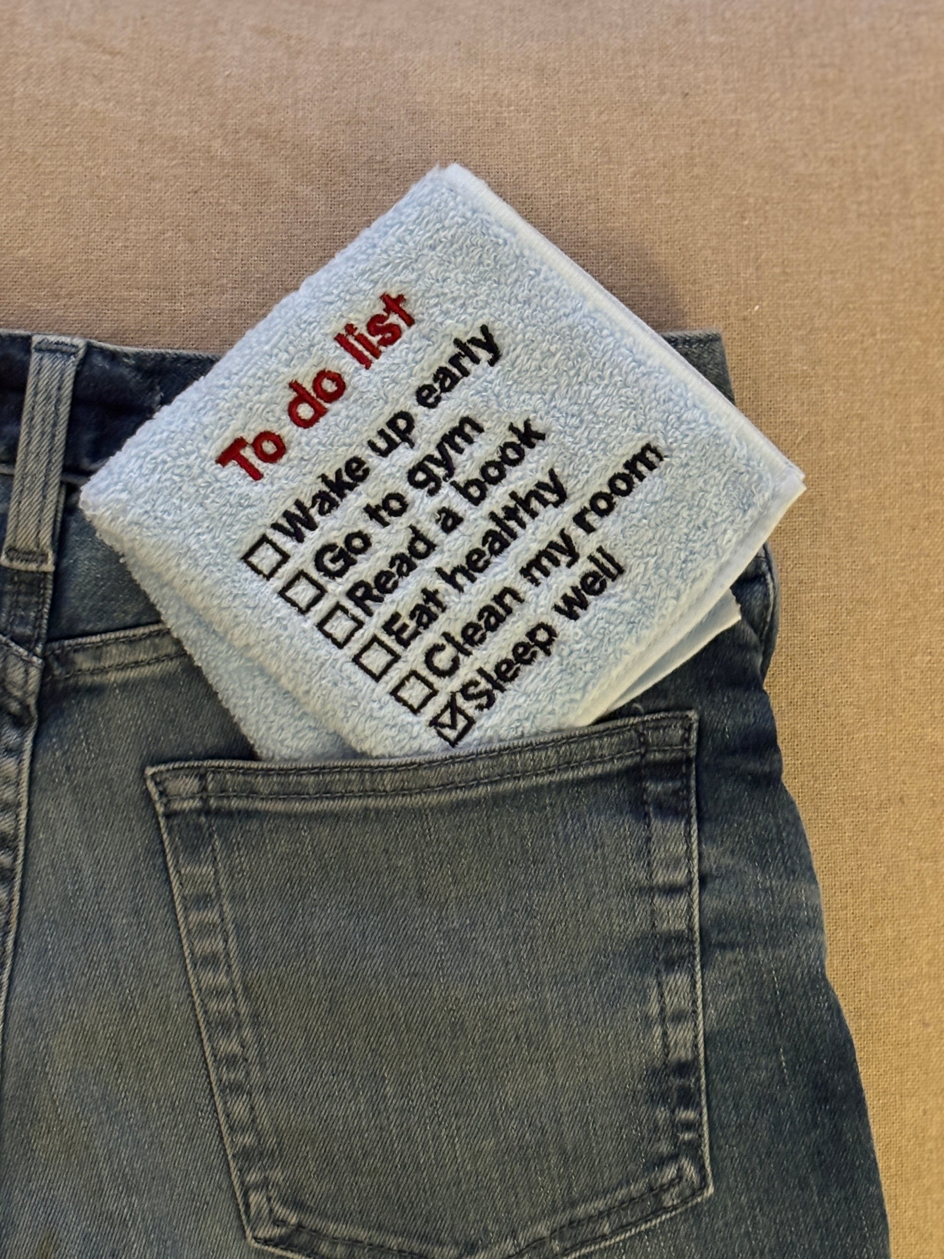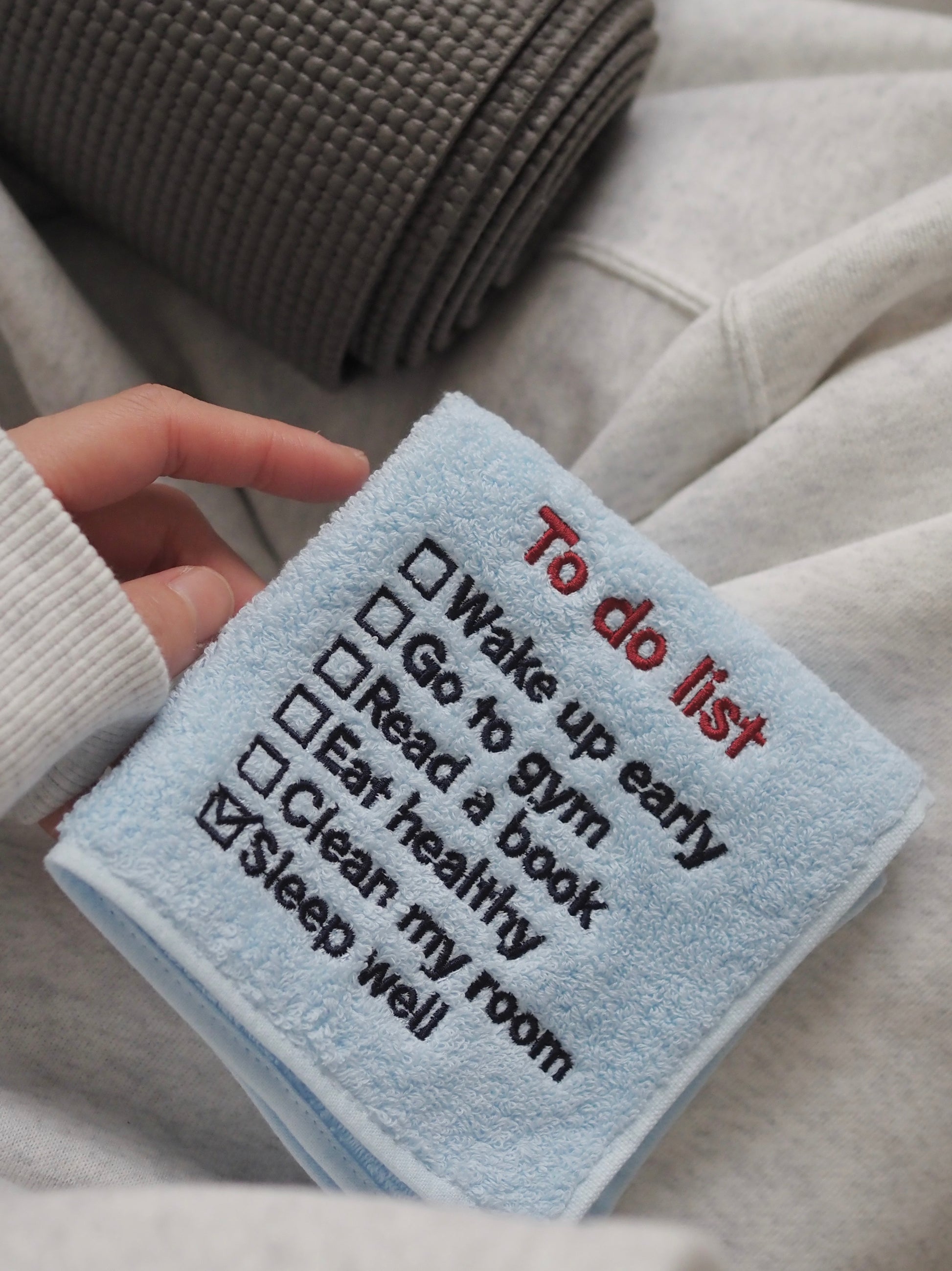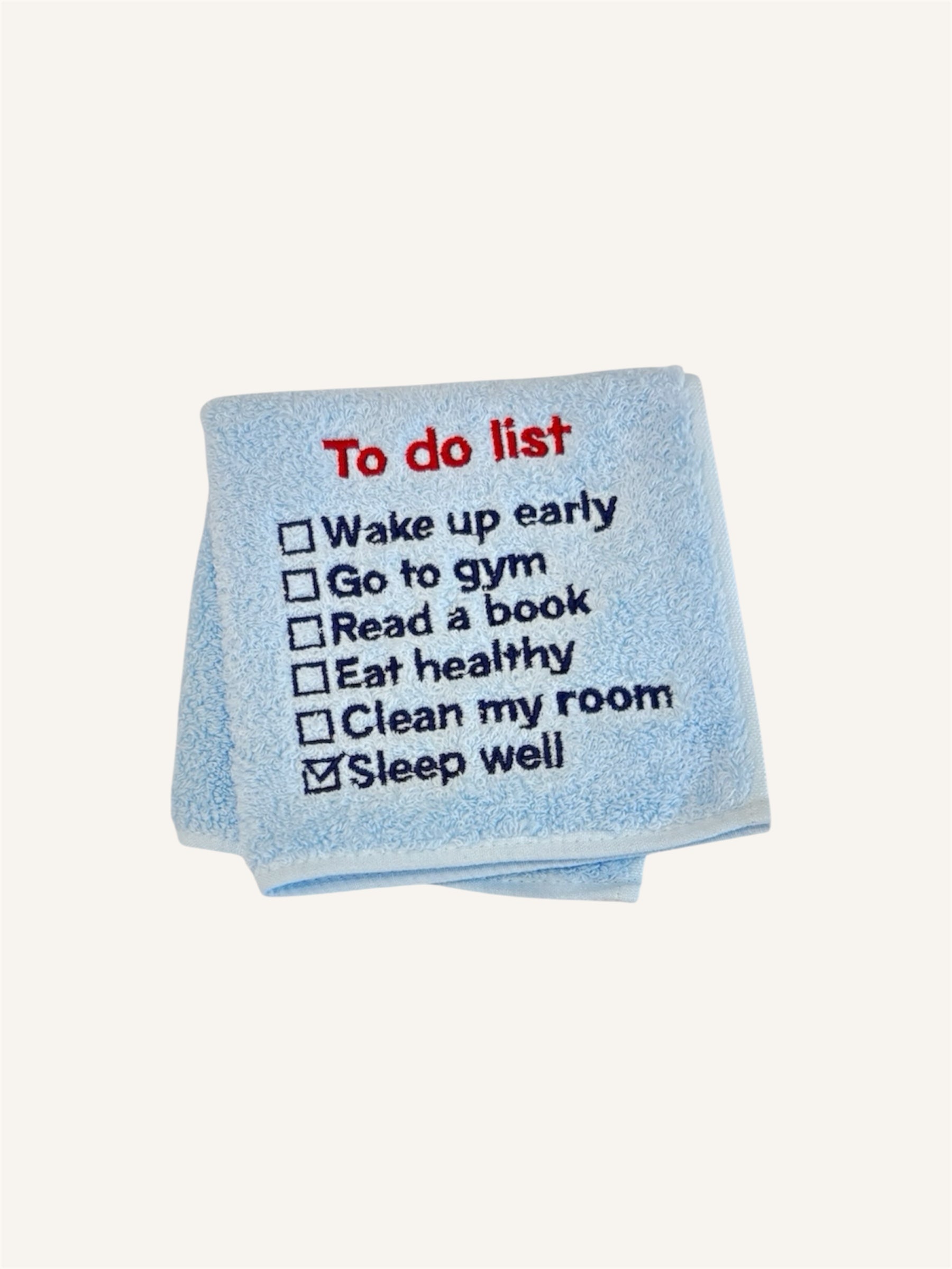 綿100%製のやわらかく丈夫で速乾性にもすぐれた今治のハンドタオルに「To do list」の文字を刺繍しました。